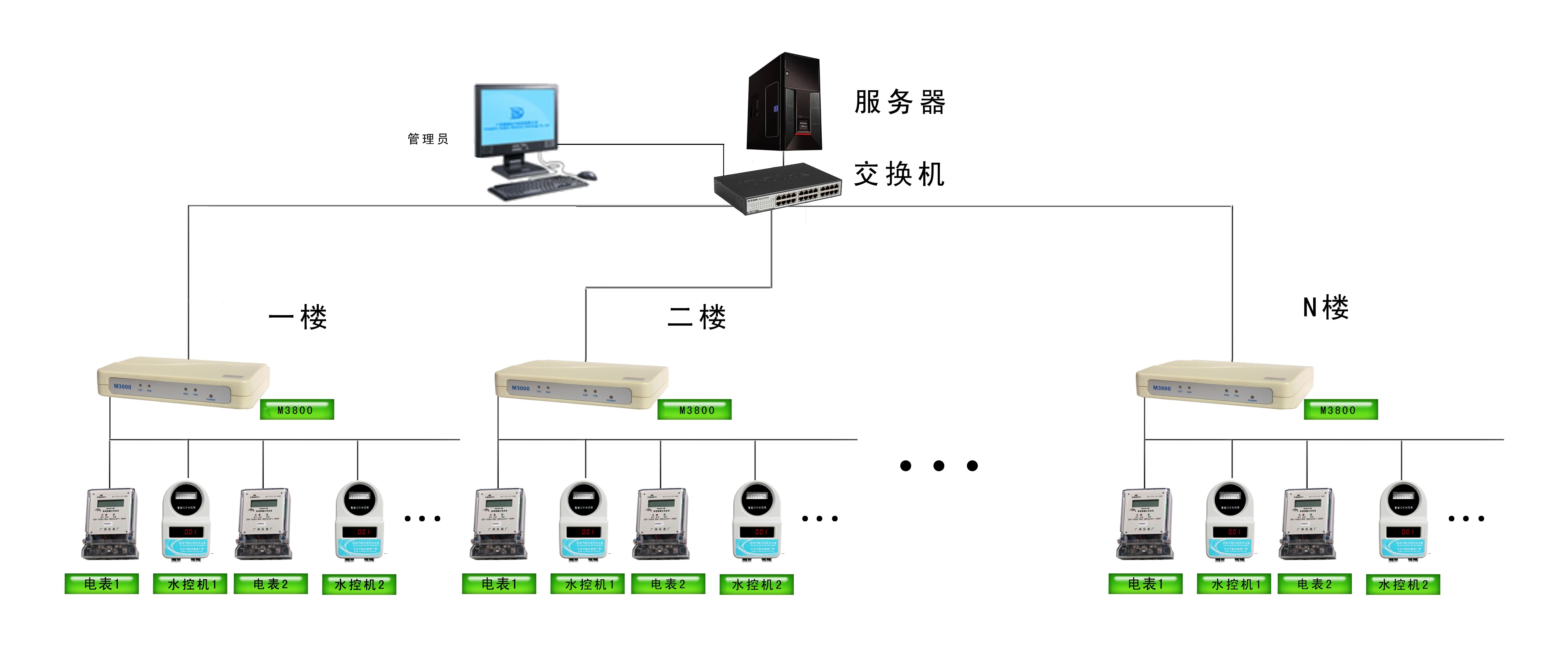 由于房間數(shù)量較多,而且分布在各個樓層,建議采用TCP/IP和485總線相結(jié)合的方式建設(shè)網(wǎng)絡(luò),每個樓層配備一個網(wǎng)絡(luò)管控器,向上連接服務(wù)器通過內(nèi)部局域網(wǎng)(即TCP/IP的方式),在樓層內(nèi)采用485總線的方式連接水表和電表既節(jié)省網(wǎng)線架設(shè)的費(fèi)用,又很清晰地分樓層管理,方便維護(hù)。